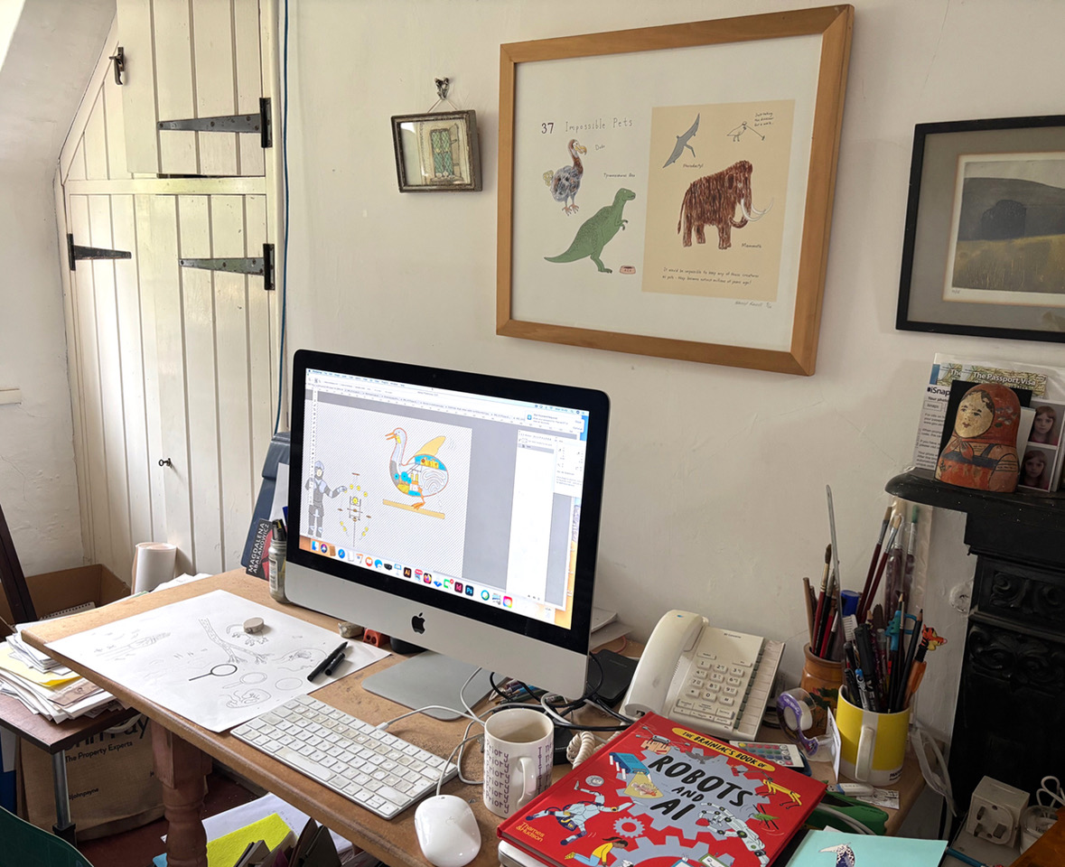 Als ich mit der Arbeit an dem Buch begann, wusste ich nicht wirklich viel über Roboter und ich wusste auch nicht, wie viele von ihnen aussahen. Ich brauchte wirklich gute Referenzen, auf die ich beim Zeichnen zurückgreifen konnte! Ich weiß jetzt definitiv mehr über die verschiedenen Aufgaben, für die Roboter eingesetzt werden, als zuvor. KI ist ein Bereich, der sich ständig verändert und für Künstler und Illustratoren ein Problem darstellt, da Menschen begonnen haben, KI zur Erstellung von Bildern zu nutzen, anstatt uns zu beschäftigen.