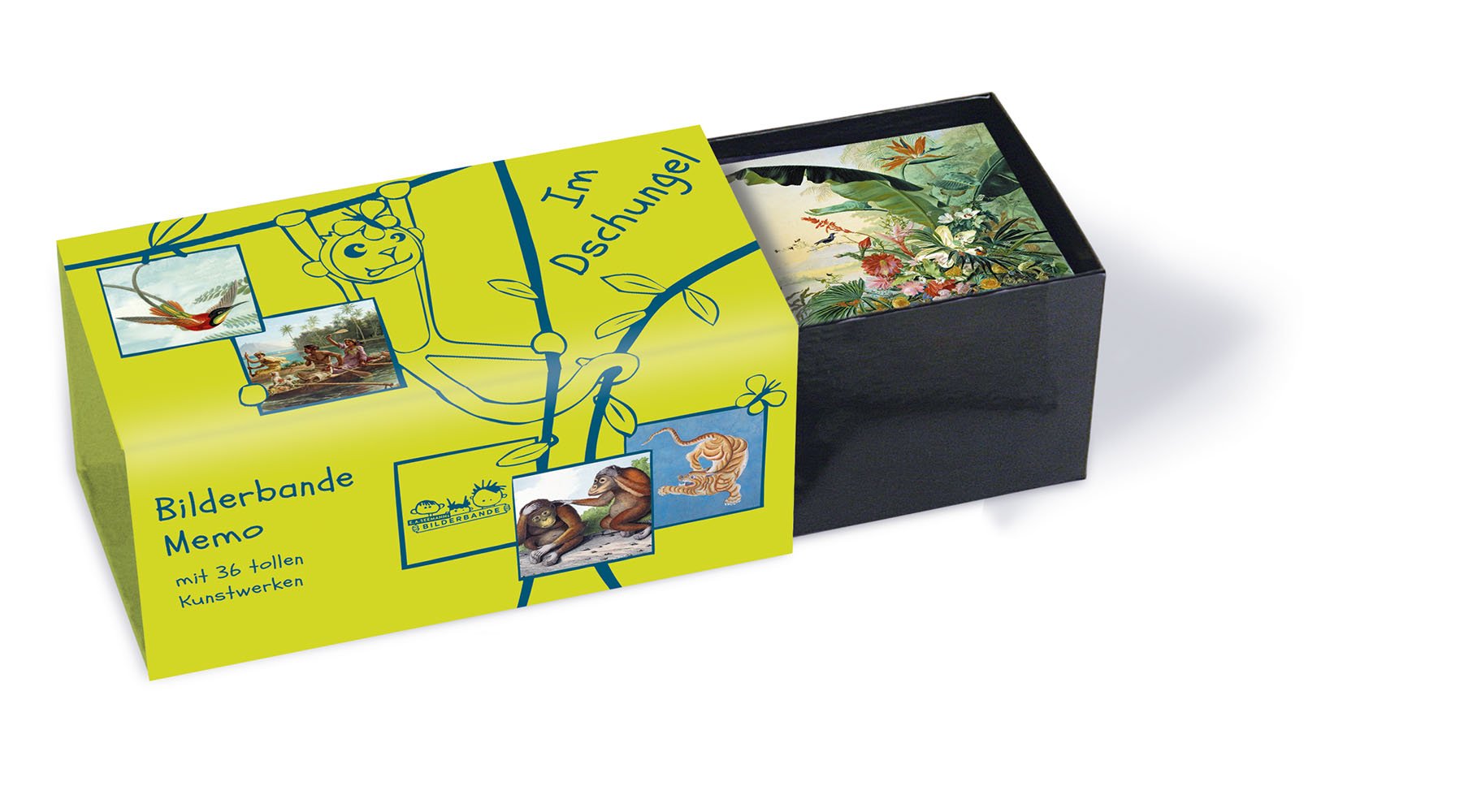 Sei kein Faultier und mach mit hier! Beim BILDERBANDE-Memo geraten alle außer Rand und Band: Schimpanse und Gorilla, Papagei und Elefant – wer hat zuerst alle zusammenge-hörenden Kartenpaare in der Hand? Dieses Spiel ist garantiert so spannend wie das „Dschungelbuch“, so aufregend wie eine Folge von „Tarzan“. Denn bei dem Streifzug durch den Regenwald trifft man den Panther Bagheera und den Schimpansen Cheeta. Tauche ein in die Tiefen des Urwalds und lerne berühmte Künstler kennen, die affenstarke Bilder geschaffen haben: den Tiermaler August Macke, den Südseemaler Paul Gauguin, den naiven Künstler Henri Rousseau und seine exotischen Pflanzen: Lilien, Lotusblumen, Farne, rot blühende tropische Kaktusse. Und natürlich Palmen, auf denen die braunen Orang-Utans Pongo und Bongo toben oder die hungrige Riesenschlage Boa Boa aufs leckere Abendessen, den Kakadu, wartet. Wenn du ihn retten willst, dann sei auf Zack und finde blitzschnell das Kakadu-Pärchen zwischen den anderen Memo-Kärtchen. Oder hole Hilfe, indem du im verschlungenen Wald nach Louis Dodds Dschungel-Bewohnern suchst. In Kanus, mit Pfeil und Boden rasen sie über den Amazonas und setzten die Schlange schachmatt. – Auf so einer spannenden Expedition wird keiner nass – und es gibt viel Spaß.