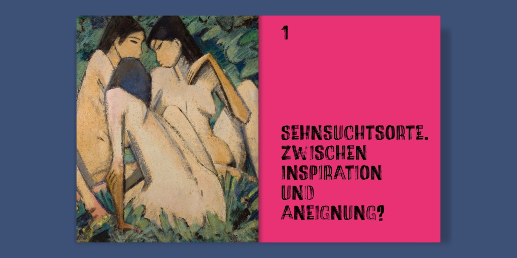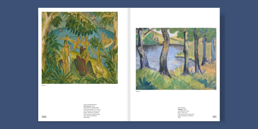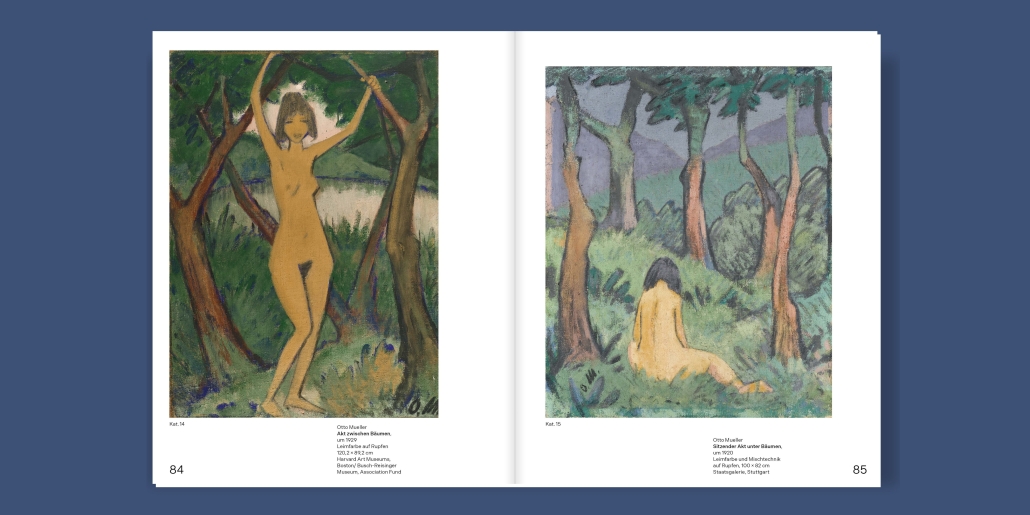 Wie viele andere Künstler:innen der Moderne hatte Mueller Interesse an anderen Kulturen und sammelte außereuropäische Kunst. Neben dem Motiv der Badenden finden sich im Werk des Expressionisten Selbstbildnisse, Darstellungen von Masken, Holzschnitte sowie Wandmalereien. Auch Mueller war auf der Suche nach dem vermeintlich „Ursprünglichen“, das er im Einklang von Mensch und Natur zu finden glaubte, ebenso wie in einer Lebensweise, die dem bürgerlichen Leben, das er ablehnte, entgegenzustehen schien. Aber inwieweit bedient die Darstellung weiblicher Akte einen männlich sexualisierenden Blick? Welche Bedeutung hat Muellers Darstellung von Schwarzen Menschen und afrikanischen Masken? Wie gehen wir heute mit einer romantisierten Vorstellung von Sinti:zze und Rom:nja um, die sich in vielen seiner Werke wiederfindet? Benutzen wir seine originalen Werktitel, auch wenn wir sie heute als diskriminierend begreifen? In der Betrachtung der Kunst der Moderne nimmt der Katalog gegenwärtige Fragestellungen um Rassismus und Diskriminierung auf. Er eröffnet eine Möglichkeit, mit der Kunst nach Antworten auf diese Fragen zu suchen.