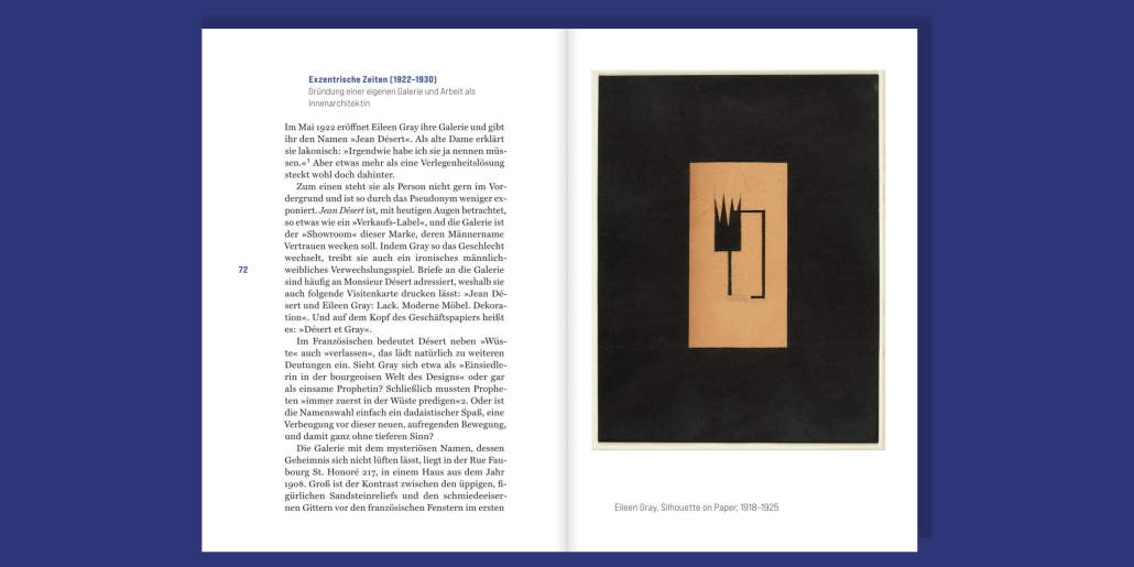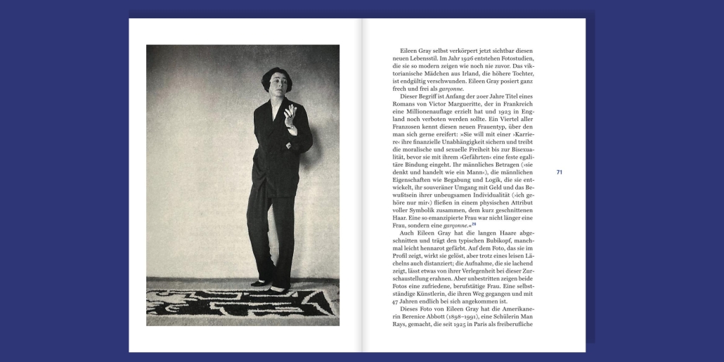 Mit Sachverstand und Einfühlungsvermögen folgt Autorin Charlotte Kerner der Geschichte einer unangepassten Kreativen, die sich im frühen 20. Jahrhundert ihren eigenen Weg bahnte. Das Buch führt durch die Kindheit und Jugend Grays als Debütantin im edwardianischen England sowie ihre Lehrjahre in London zu ihrer Wahlheimat Paris, wo sie eine eigene Galerie eröffnete und als Innenarchitektin erfolgreich wurde. Grays Beziehungen zu der Chansonnière Damia sowie dem Architekten Jean Badovici werden ebenso beleuchtet wie die Freundschaft zu ihrem späteren Biografen Peter Adams und das umstrittene Verhalten Le Corbusiers, der die Wände ihrer Villa E.1027 bemalte. Reich bebildert mit historischen Aufnahmen und erstmals farbigen Abbildungen ihrer Teppich- und Textilentwürfe, zeichnet diese Biografie ein lebendiges Porträt der visionären Gestalterin.