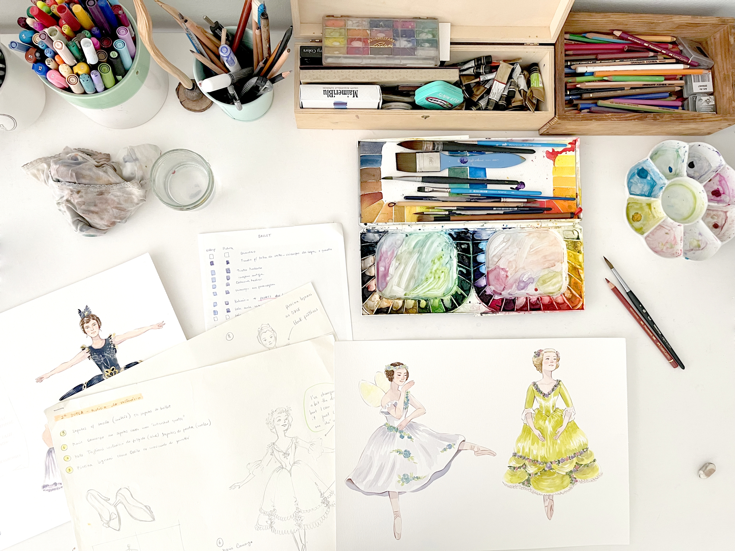 Dieses Buch war eine große Herausforderung, insbesondere was die Konsistenz der Bildsprache angeht. Es ist ein recht umfangreiches Buch mit vielen Illustrationen, bei denen hochtechnische Zeichnungen, wie Ballettpositionen oder die Räume, in denen die Szenen spielen, mit eher atmosphärischen und poetischen Illustrationen kombiniert werden, wie beispielsweise den Balletten, die uns in die Magie jeder Geschichte entführen sollen.